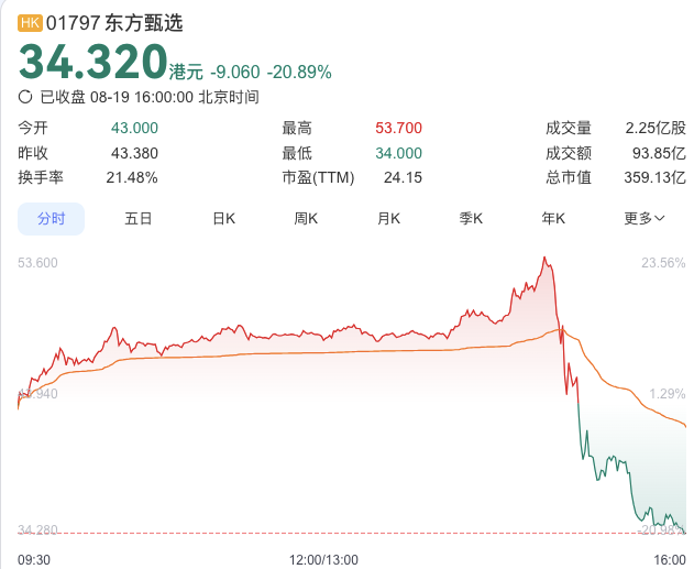 当天下昼,东方甄选股价演出1小时过山车,从涨23%到跌20%。下昼2点50分东方甄选股价还暴涨超23%,到4点收盘前股价跌超20%,报收34.3港元。